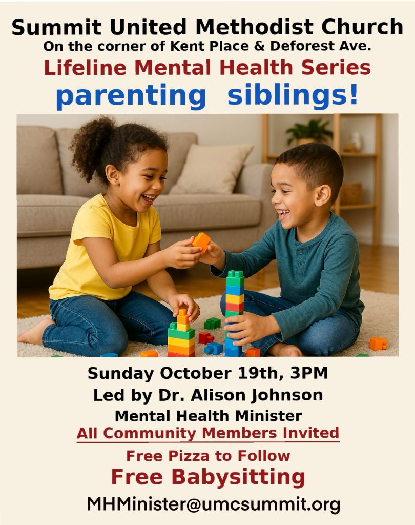 Join us for a free Lifeline Mental Health series event, “Parenting Siblings” in the UMC Social Hall, from 3:00 to 5:00 p.m. This event is open to the public.